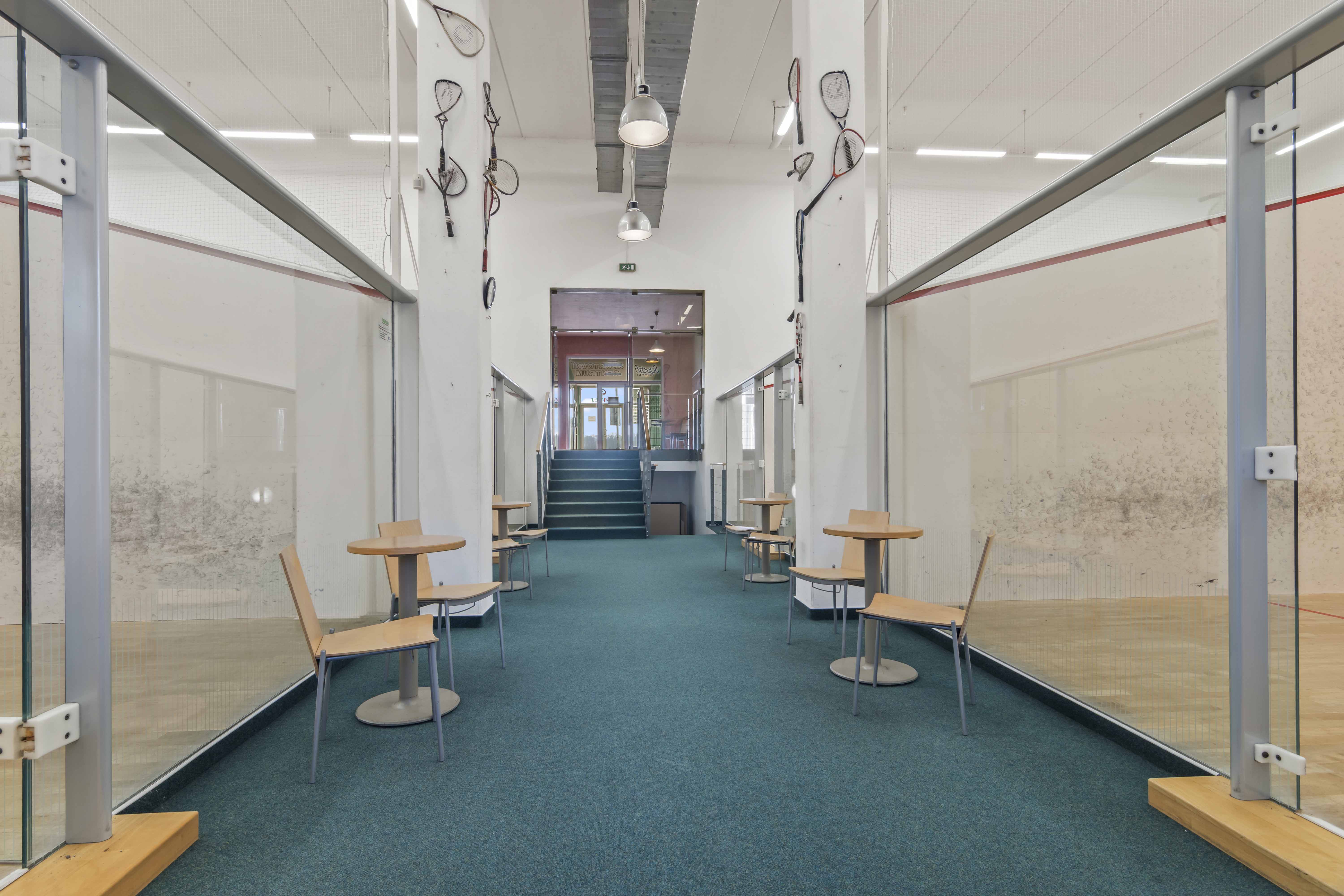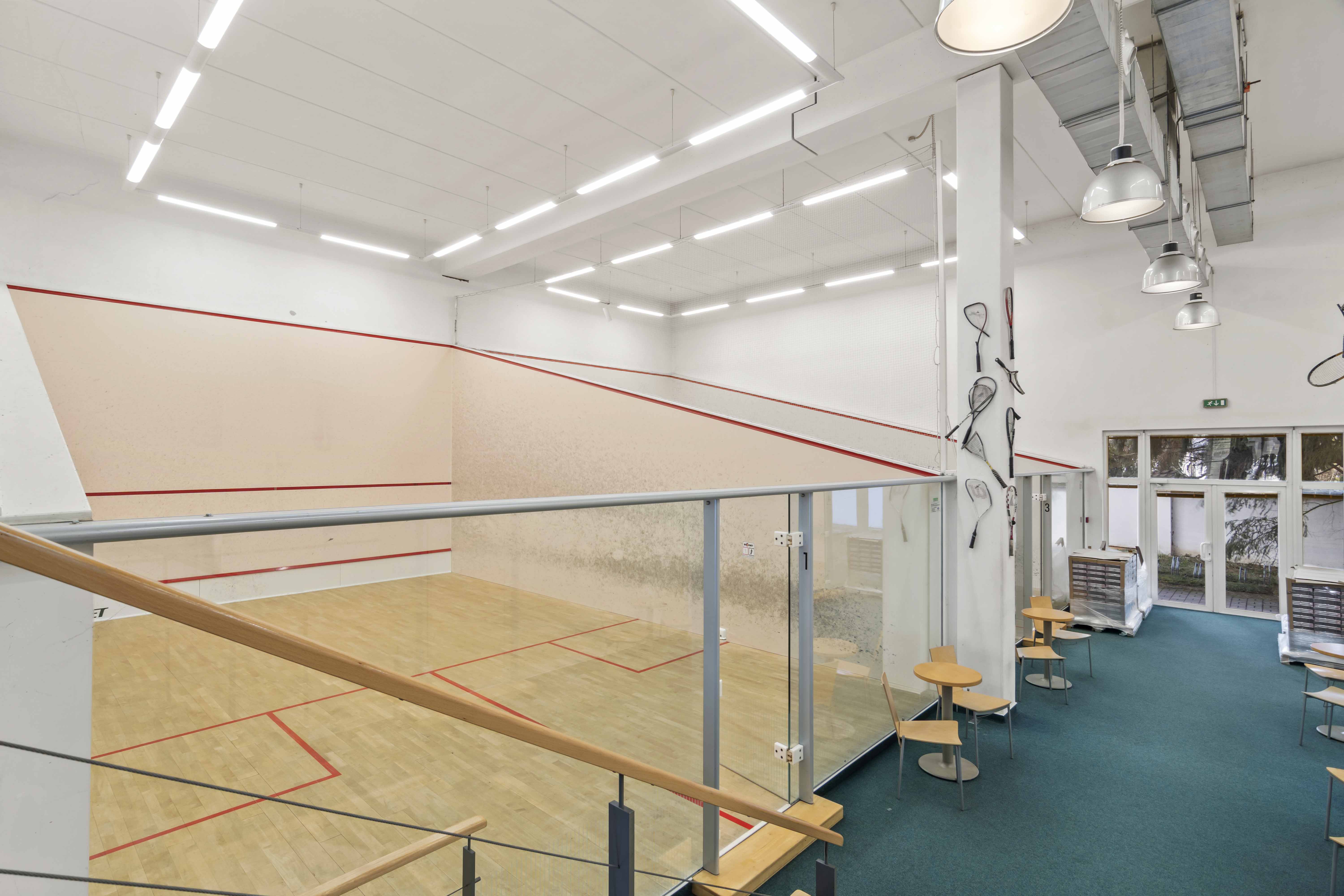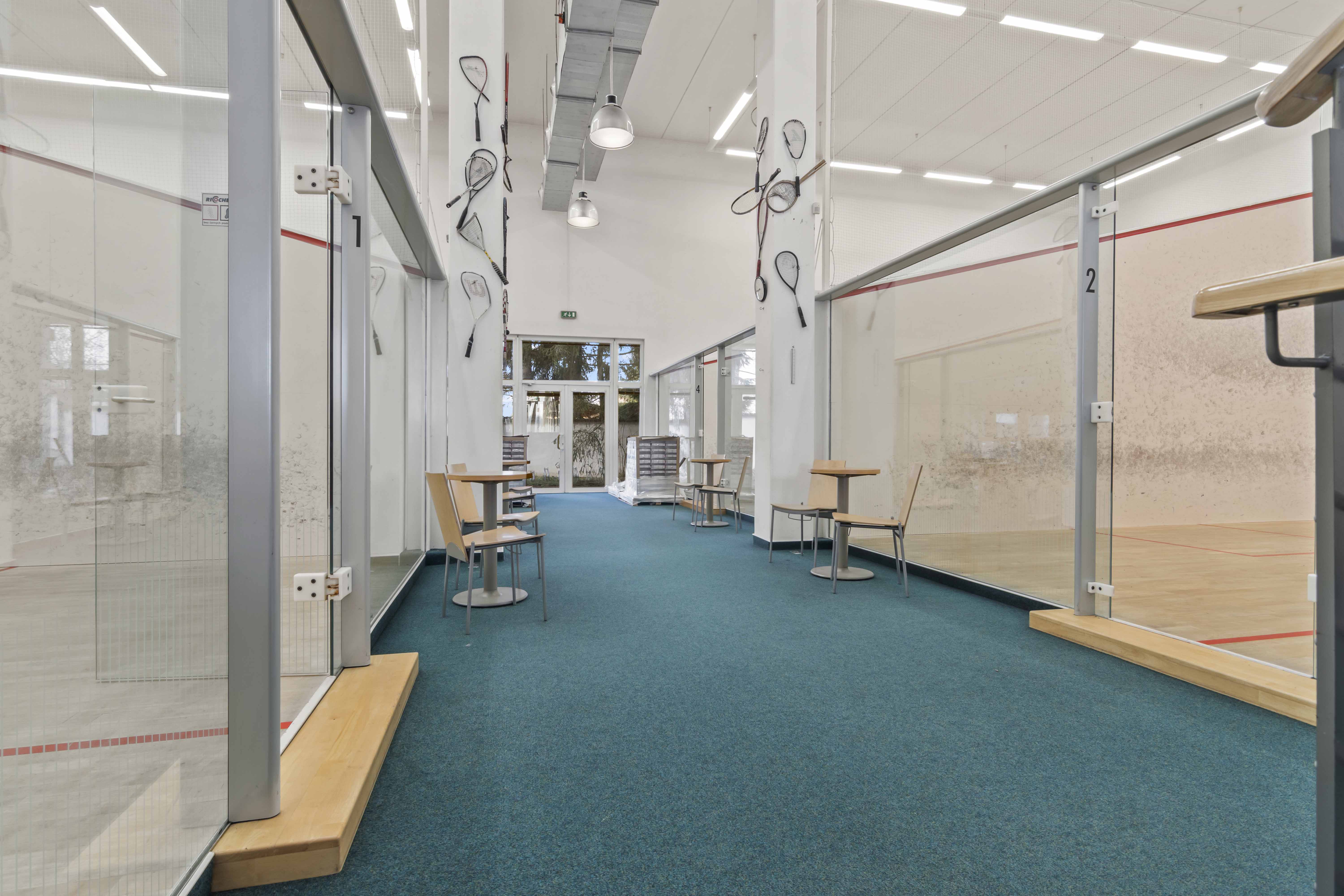 Přízemí (1. NP 541m2: Sportovní srdce objektu 4 squashové kurty s výškou přes dvě podlaží.Prostory pro posilovnu.Reprezentativní recepce se zázemím a barem.Šatny a sprchy pro sportovce.